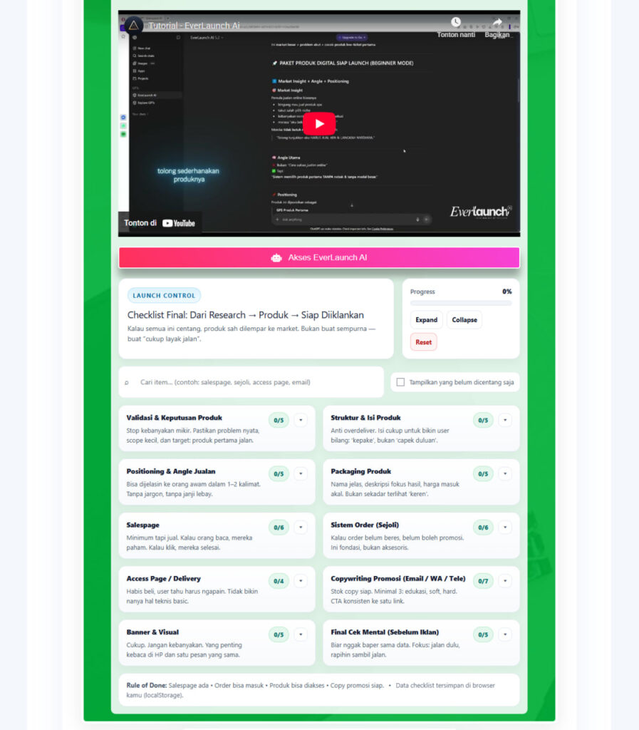 Tersedia tools Checklist yang ngebimbing dari awal research sampai produk siap diiklankan. Bukan checklist teori. Tapi checklist praktis, seperti: – validasi ide – struktur produk – positioning – salespage – sistem order – access page – stok copywriting – sampai cek mental sebelum iklan. Fungsinya : ngasih kepastian kapan produk boleh dilempar ke market. Kalau semua poin sudah dicentang, kamu nggak perlu nebak-nebak lagi.